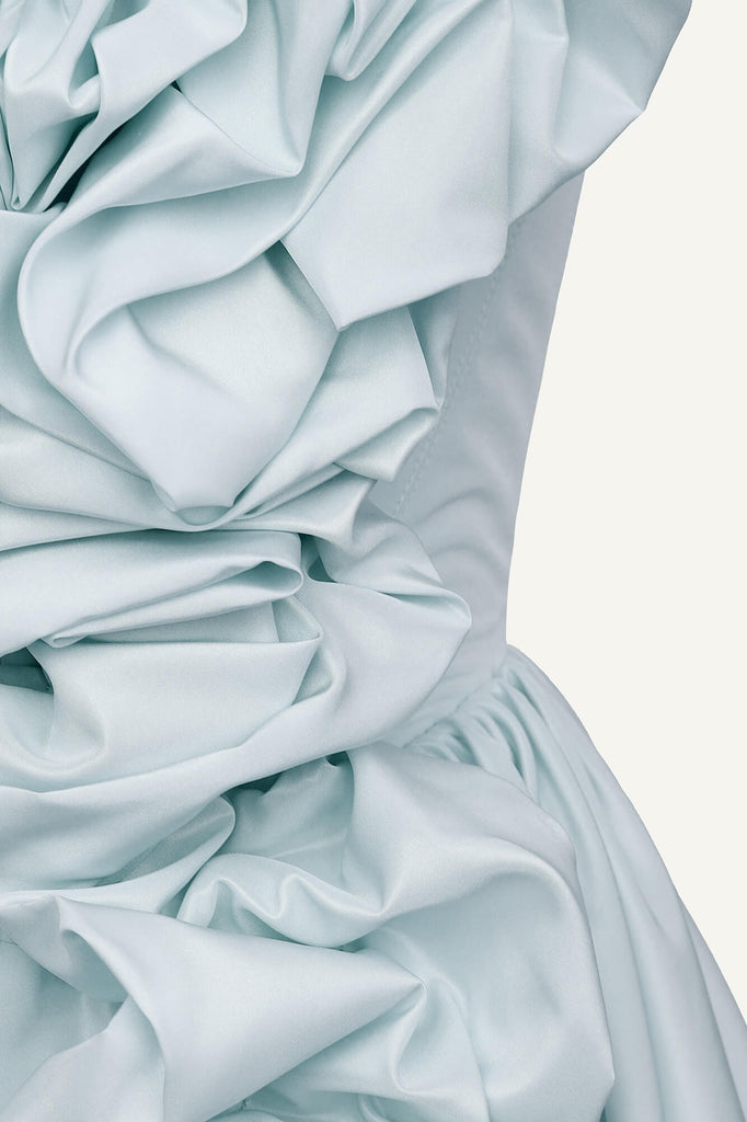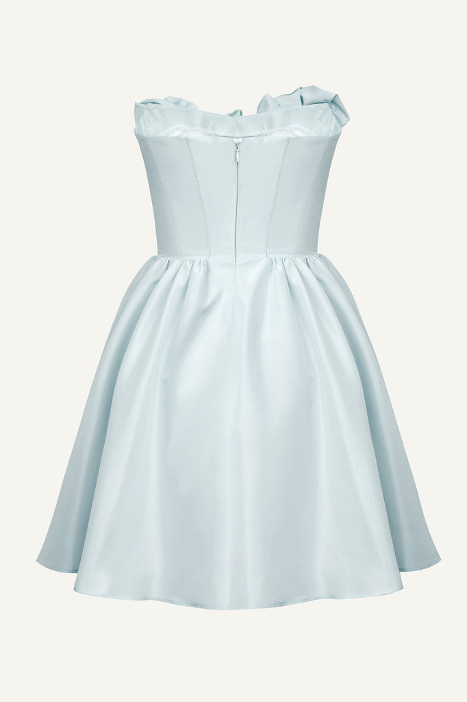 An airy satin bustier dress in a delicate blue shade. Decorative gathers on the bodice and skirt make the look playful and feminine. A soft corset bodice without cups perfectly shapes the figure, emphasizing the neckline and shoulders, and a fluffy mini skirt will allow you to demonstrate all the beauty of your legs. A hidden zipper on the back in the middle seam. A fly-away lining on the skirt.