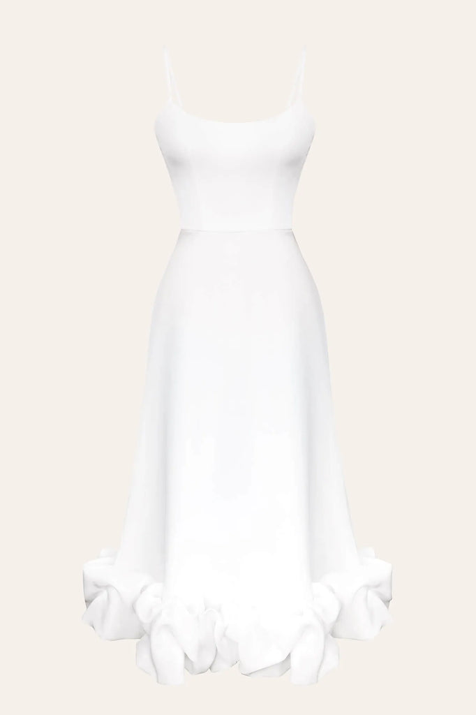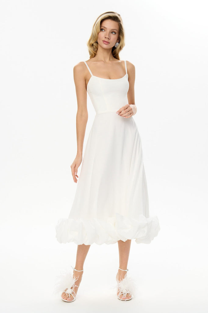 Flounce Bustier Midi Dress in Milk Color. The corset with bones and cups flatters the body shape while the flounce in the bottom creates a dreamy and romantic feel. The dress fastens with a hidden zipper. Lined.