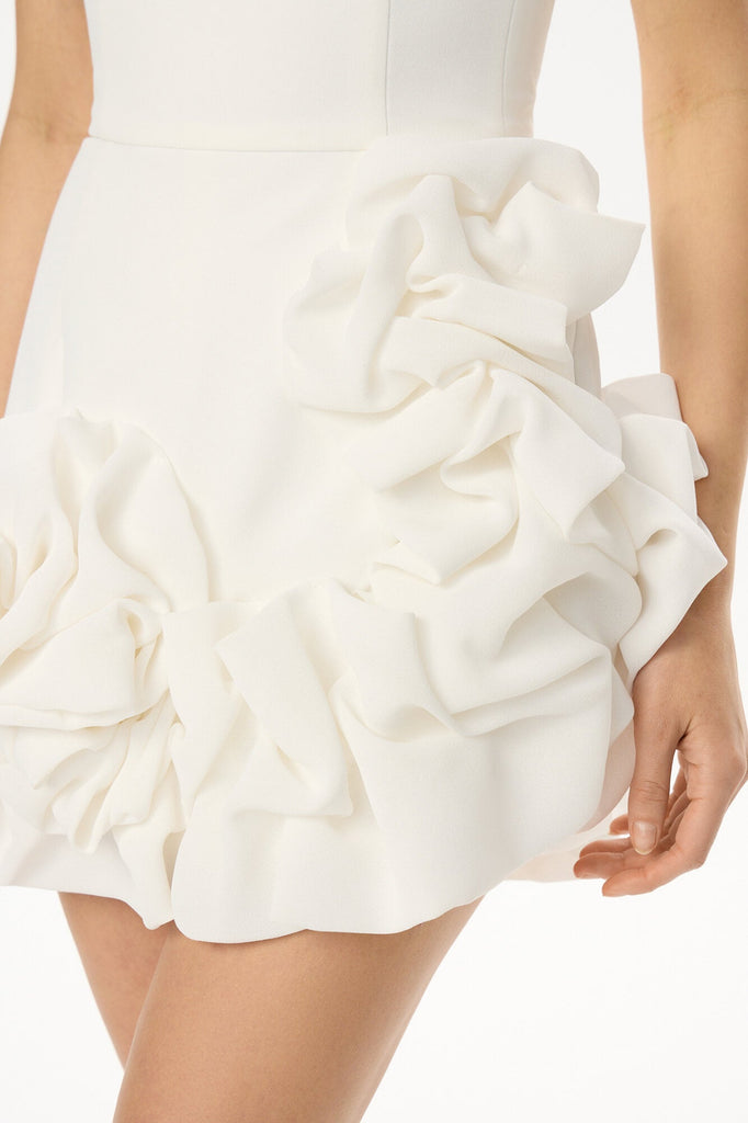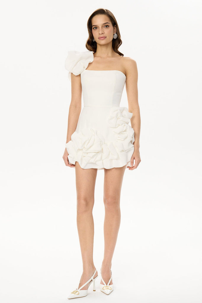 Marshmallow with sweetened coconut might accompany your coffee break or sunset prosecco glass. When we say we mean this exquisite bustier mini dress in milk. Flounce bottom and a one shoulder frill create a delightful and elegant vibe, the luxurious material and its noble shade make the attire absolutely stunning. Complete the outfit with fav heels and a little bag.