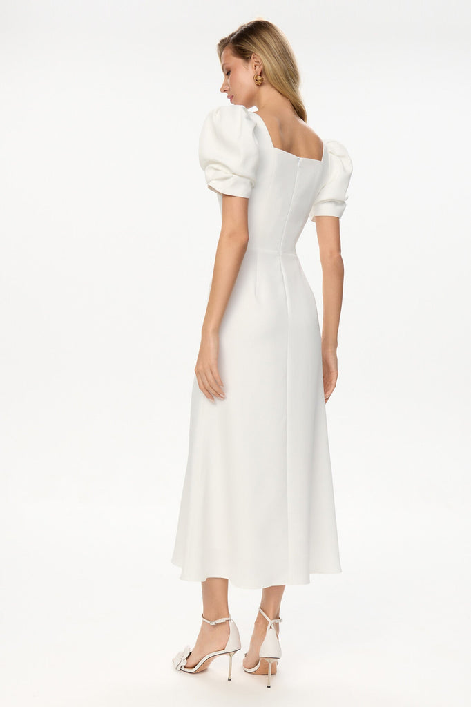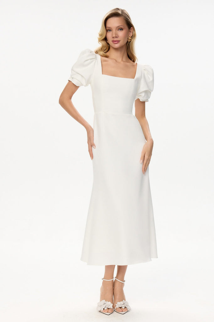 Tea party in the garden with the closests. This silhouette midi dress in White with a godet skirt is for those who opt for a classy look but want to add a little zest while keeping it minimalistic. Trendy square neck makes the appearance elegant and short sleeves make this garment perfect to be your lovely summer outfit. Lined.