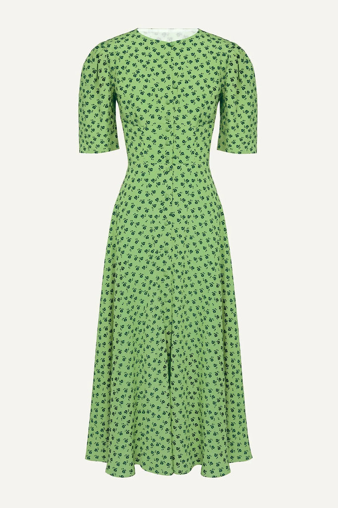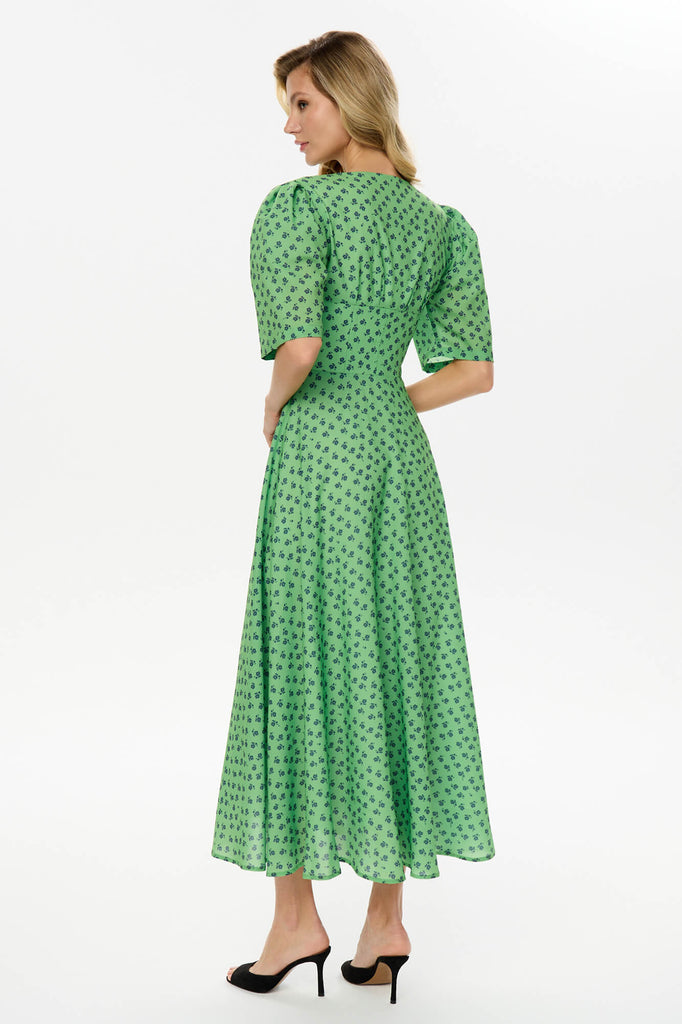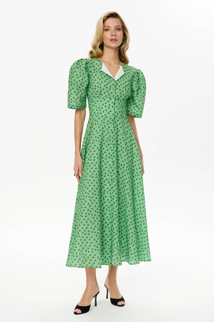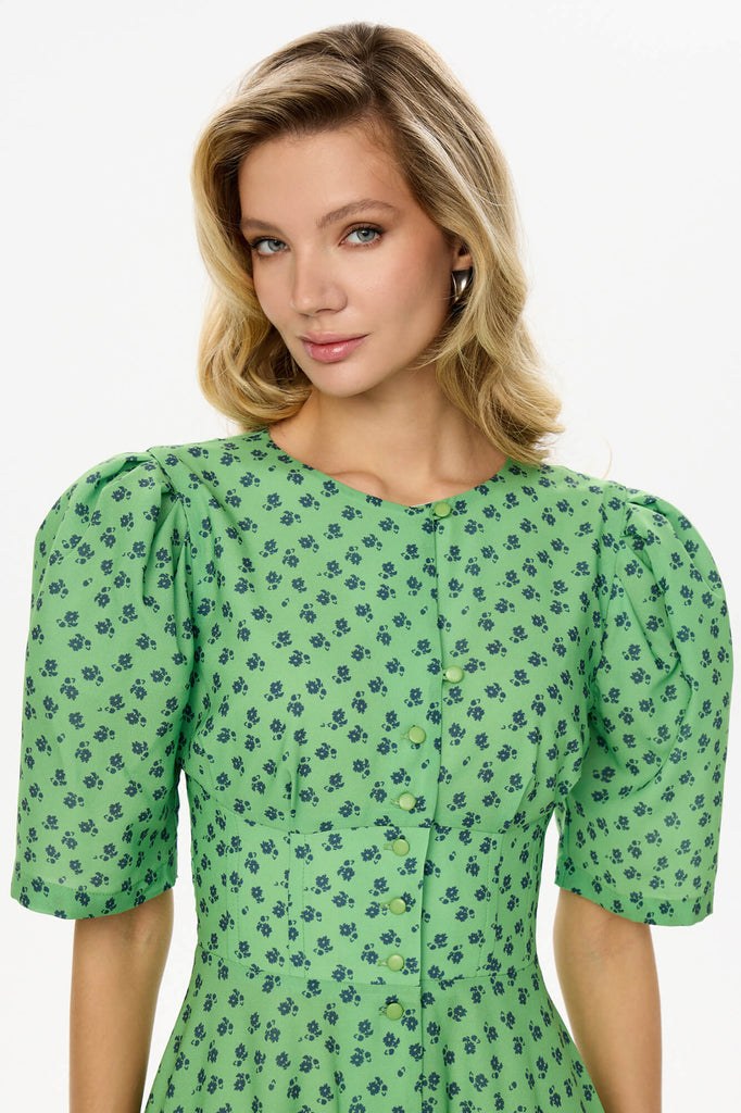 A Button Front Midi Dress in green. Floral print, contrasting lining. Puffy sleeves and a flying skirt gives a feeling of airiness and lightness. Adjust the depth of the neckline and the cut of the dress and let your mood create a special look. Make a playful look by a little buttoning or embrace your inner lady show.