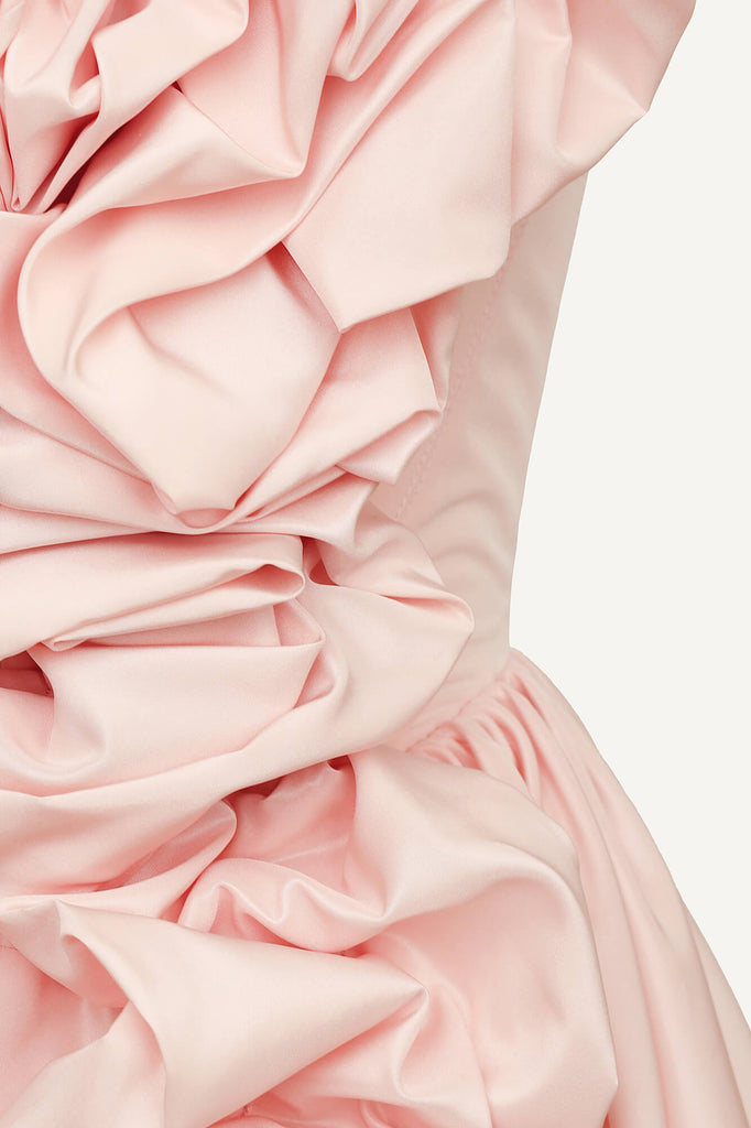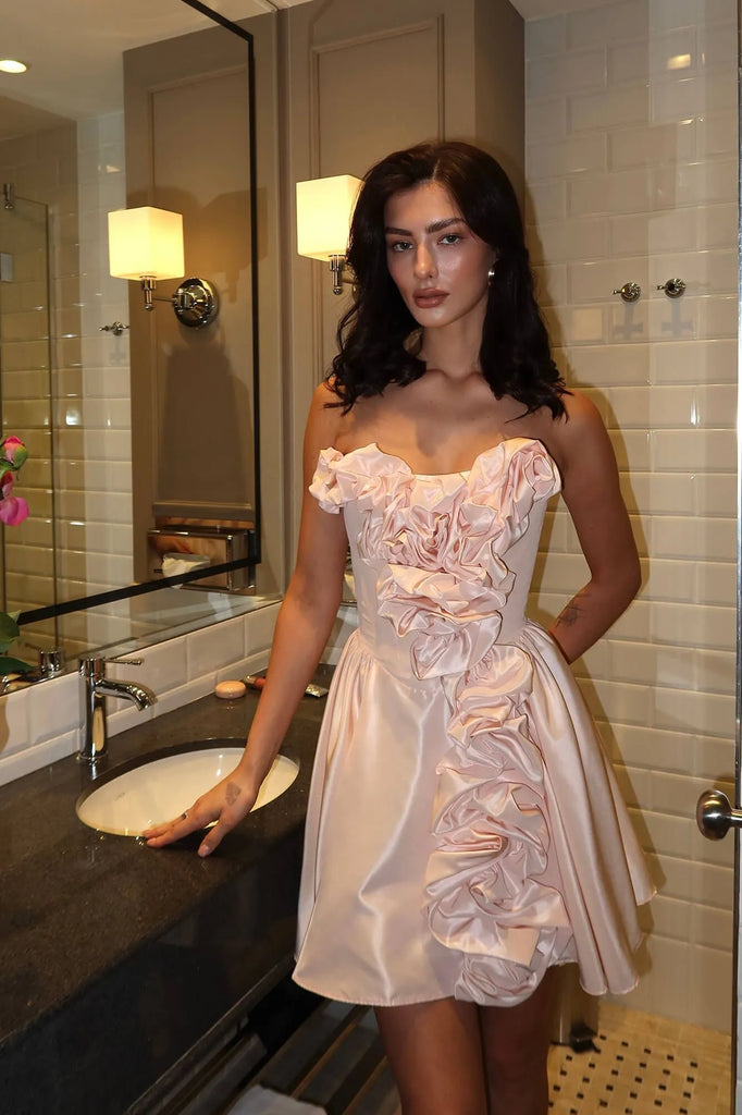 An airy satin bustier dress in a delicate pink shade. Decorative gathers on the bodice and skirt make the look playful and feminine. A soft corset bodice without cups perfectly shapes the figure, emphasizing the neckline and shoulders, and a fluffy mini skirt will allow you to demonstrate all the beauty of your legs. A hidden zipper on the back in the middle seam. A fly-away lining on the skirt.