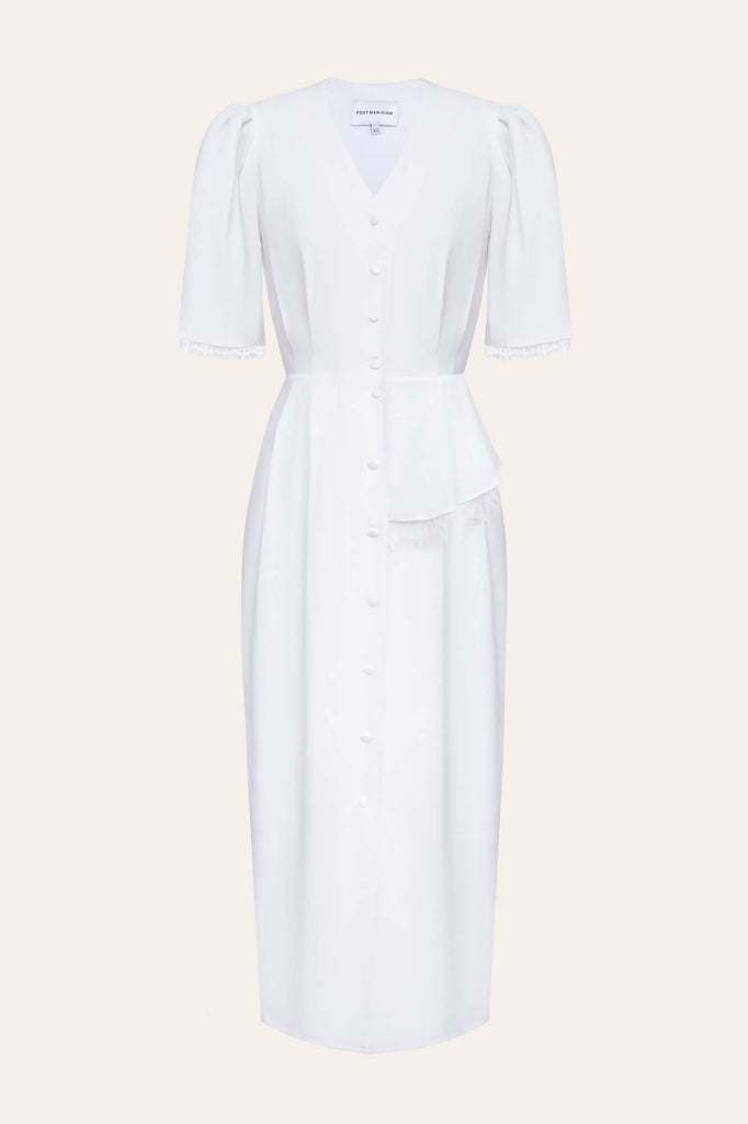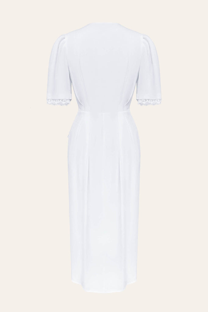 The dress aesthetic is all about evoking nostalgia and femininity. Midi length dress with buttons. Delicate lace trim on the sleeves and skirt add romantic notes. The elegant V-neck accentuates the neck and collarbones.
