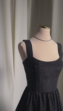 A midi dress in a deep, captivating black, featuring wide straps and a voluminous, flowing skirt. The dazzling fabric, embellished with shimmering crystals, exudes glamour and opulence. The deep, sculpted neckline elegantly highlights the décolletage and collarbone, while the fitted silhouette ensures a flawless fit, accentuating the natural contours of your figure and adding a touch of irresistible femininity and allure.
