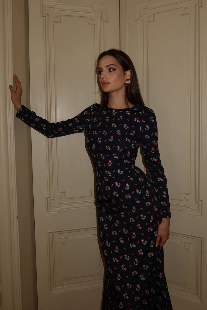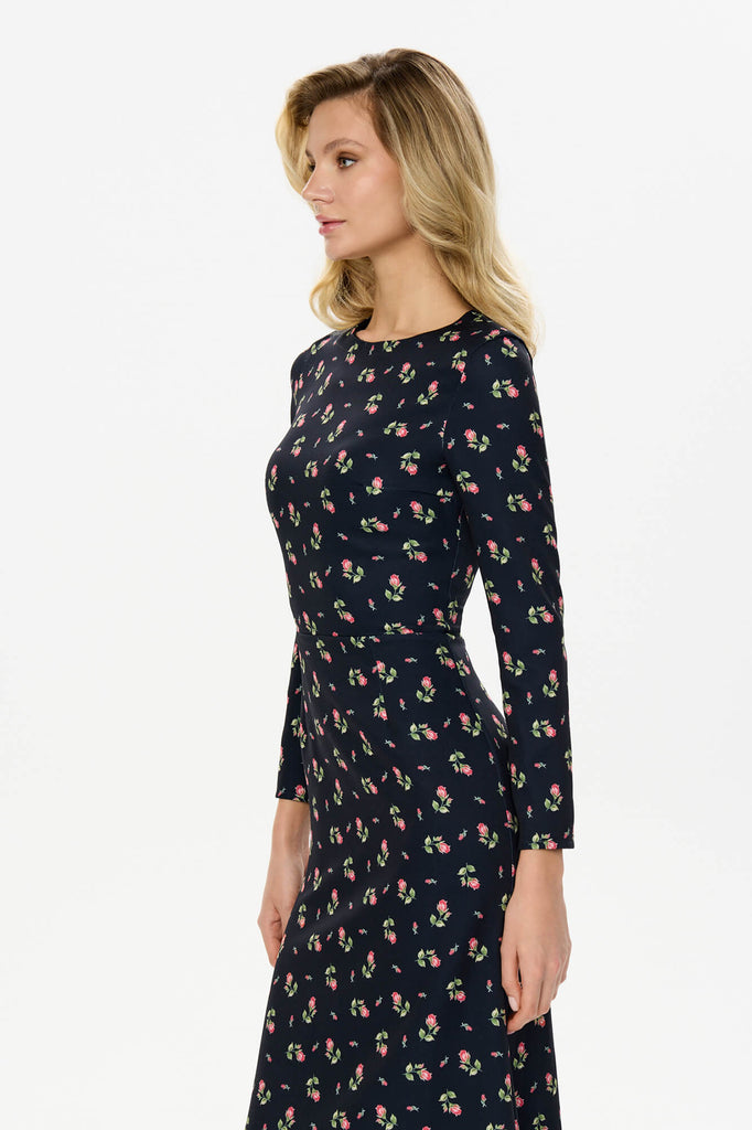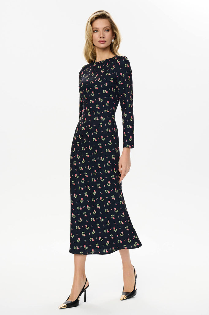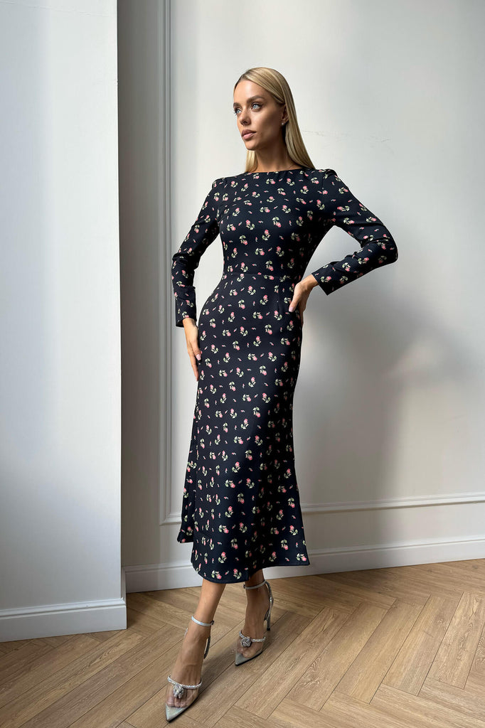 This silhouette midi dress with a godet skirt and flower pattern is for those who opt for a classy look, but want to add a little zest while keeping it minimalistic. Long set-in sleeves smoothly fit the shoulder. Lined.