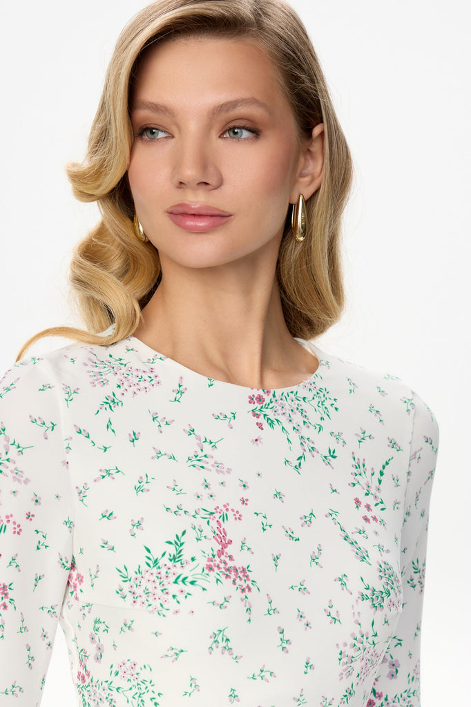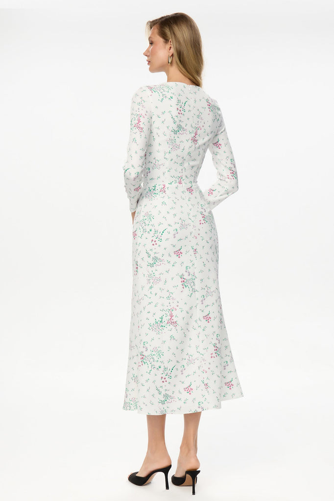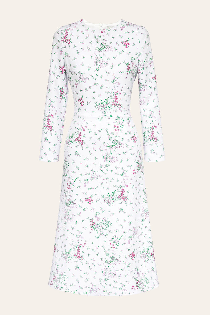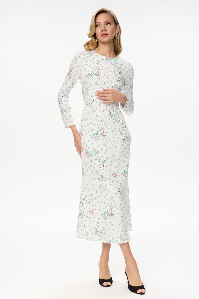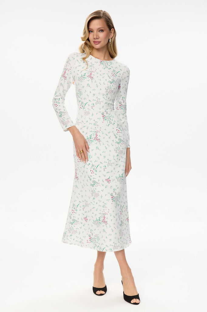 This silhouette midi dress in Milk with a godet skirt and pattern is for those who opt for a classy look, but want to add a little zest while keeping it minimalistic. Long set-in sleeves smoothly fit the shoulder. Lined.