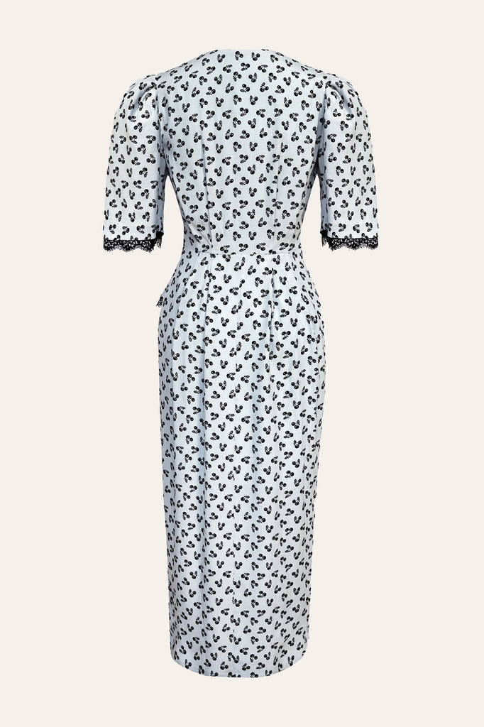 The dress aesthetic is all about evoking nostalgia and femininity. Midi length dress with buttons and a contrasting print. Delicate black lace trim on the sleeves and skirt add romantic notes. The elegant V-neck accentuates the neck and collarbones.