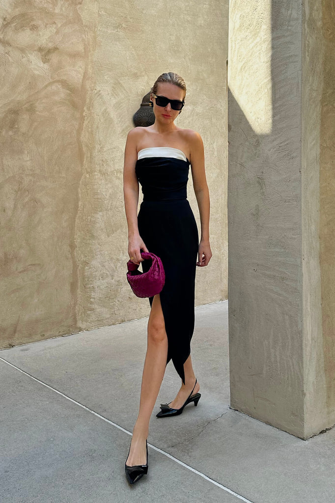 Elegant black satin dress in midi length. Its contrasting lapel design with draperies on the bodice emphasizes the elegance of the shoulder and collarbone lines. A high slit demonstrate all the figure advantages. Complete this splendid evening outfit with the evening pumps and a clutch bag.