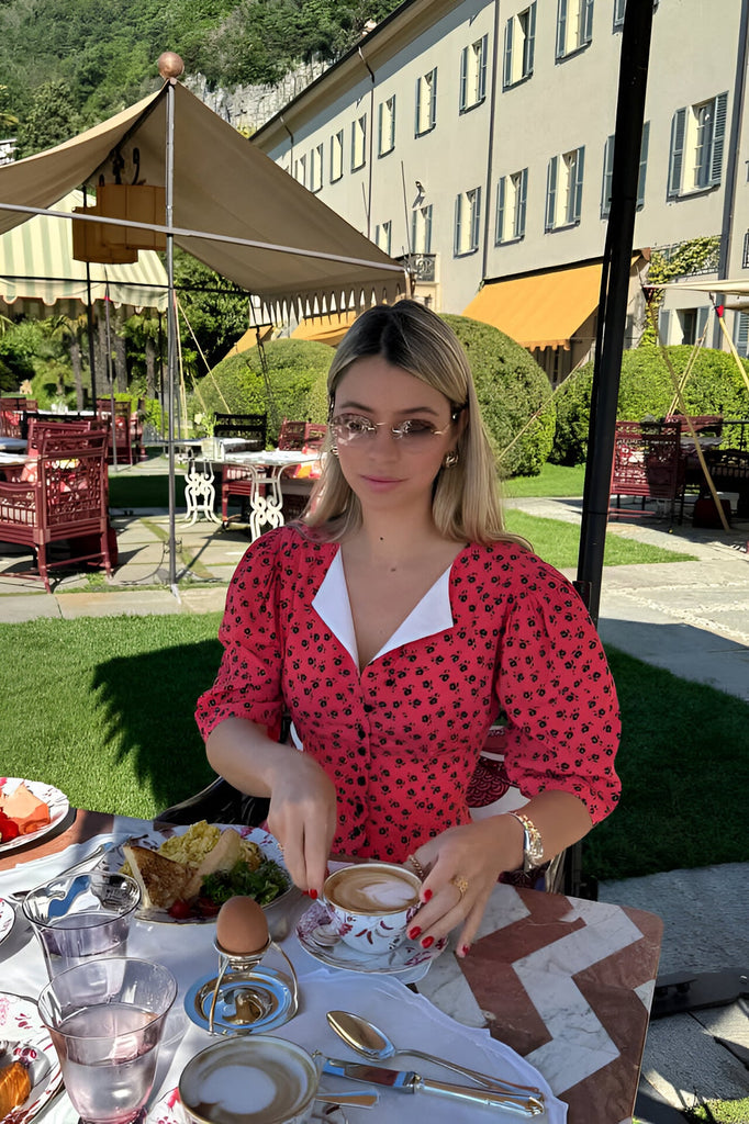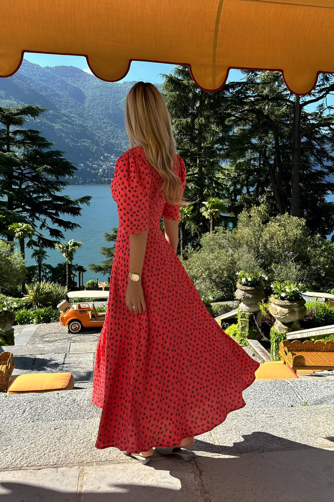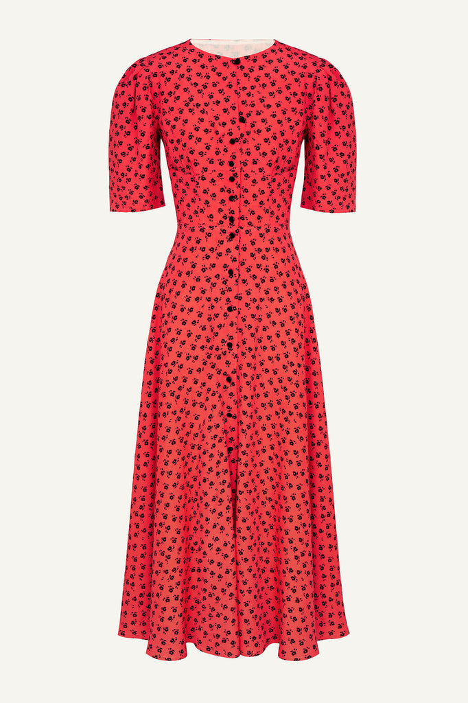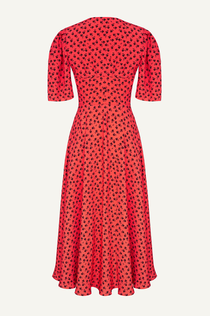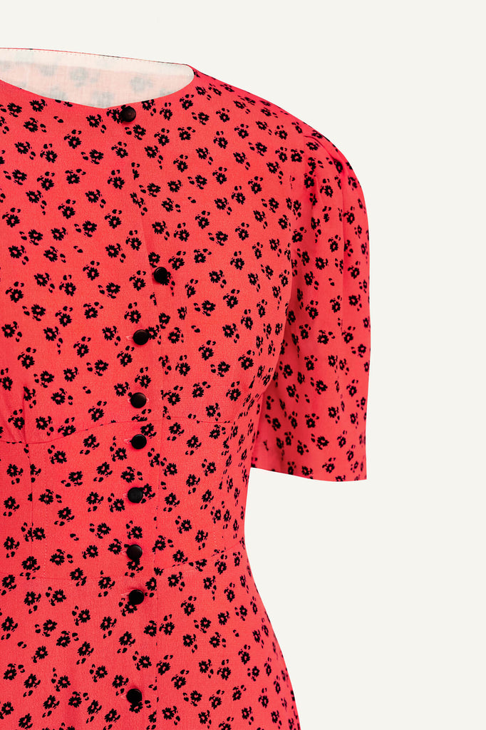 A Button Front Midi Dress in coral. Floral print, contrasting lining. Puffy sleeves and a flying skirt gives a feeling of airiness and lightness. Adjust the depth of the neckline and the cut of the dress and let your mood create a special look. Make a playful look by a little buttoning or embrace your inner lady show.