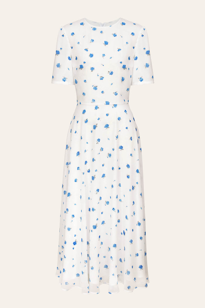 Double layer chiffon Floral Midi Dress with short sleeves. A flying sun skirt will make your look airy and delicate while the print featuring blossoms will add vivid accents. This crewneck classic silhouetted dress will defenitely become a piece of your casual summer wardrobe. Lined. Inivisible Zip Fastener.