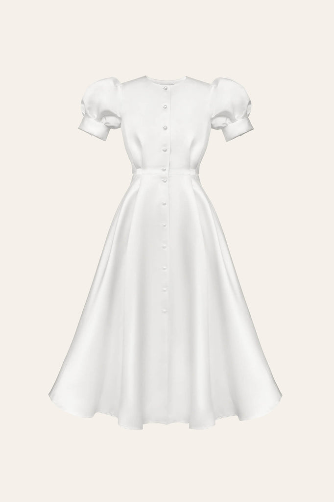 Fitted midi dress with buttons in front is an ultimate option for a chic and exquisite look. It looks casual for a daytime outfit, and puff pleated sleeves add some classy vibe to shine at a date. The fabric is medium dense. A tip: to add a bit of hot sexy vibe, do not do the bottom buttons to show off legs. Lined dress.