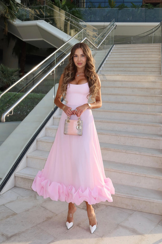 Flounce Bustier Midi Dress in Light Pink. The corset with bones and cups flatters the body shape while the flounce in the bottom creates a dreamy and romantic feel. The dress fastens with a hidden zipper. Lined.