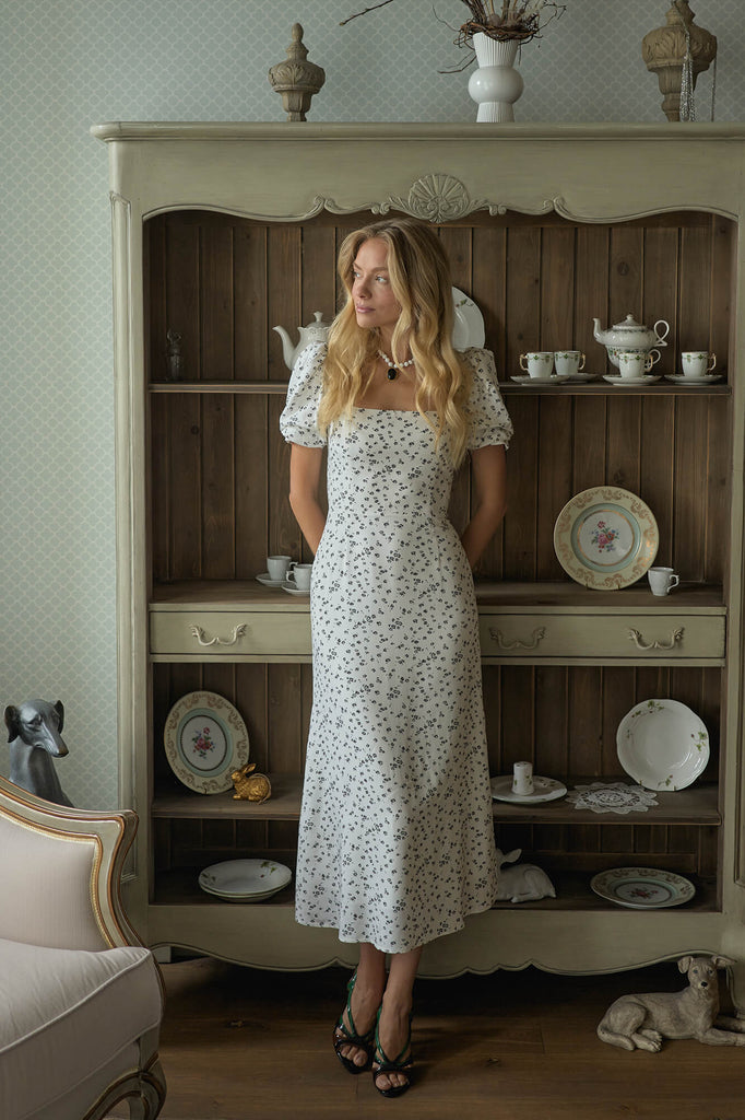 Tea party in the garden with the closests. This silhouette midi dress in Ivory with a godet skirt is for those who opt for a classy look but want to add a little zest while keeping it minimalistic. Trendy square neck makes the appearance elegant and short sleeves make this garment perfect to be your lovely summer outfit. Lined.