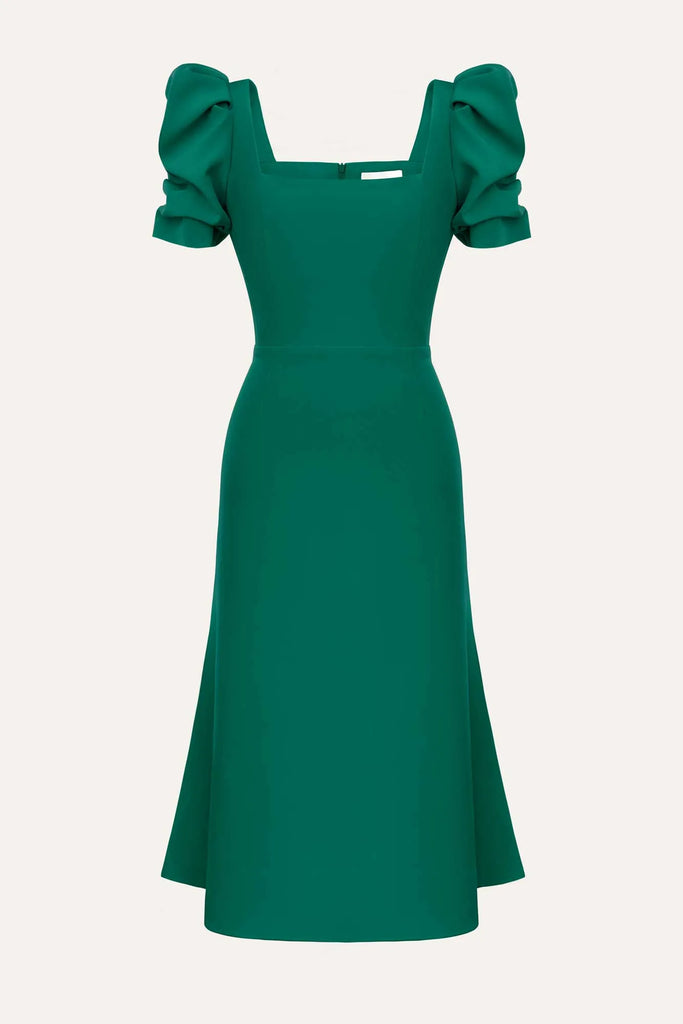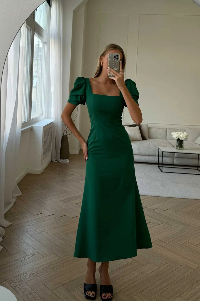 Tea party in the garden with the closests. This silhouette midi dress in Emerald with a godet skirt is for those who opt for a classy look but want to add a little zest while keeping it minimalistic. Trendy square neck makes the appearance elegant and short sleeves make this garment perfect to be your lovely summer outfit. Lined.