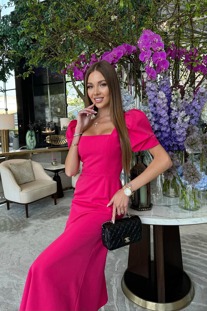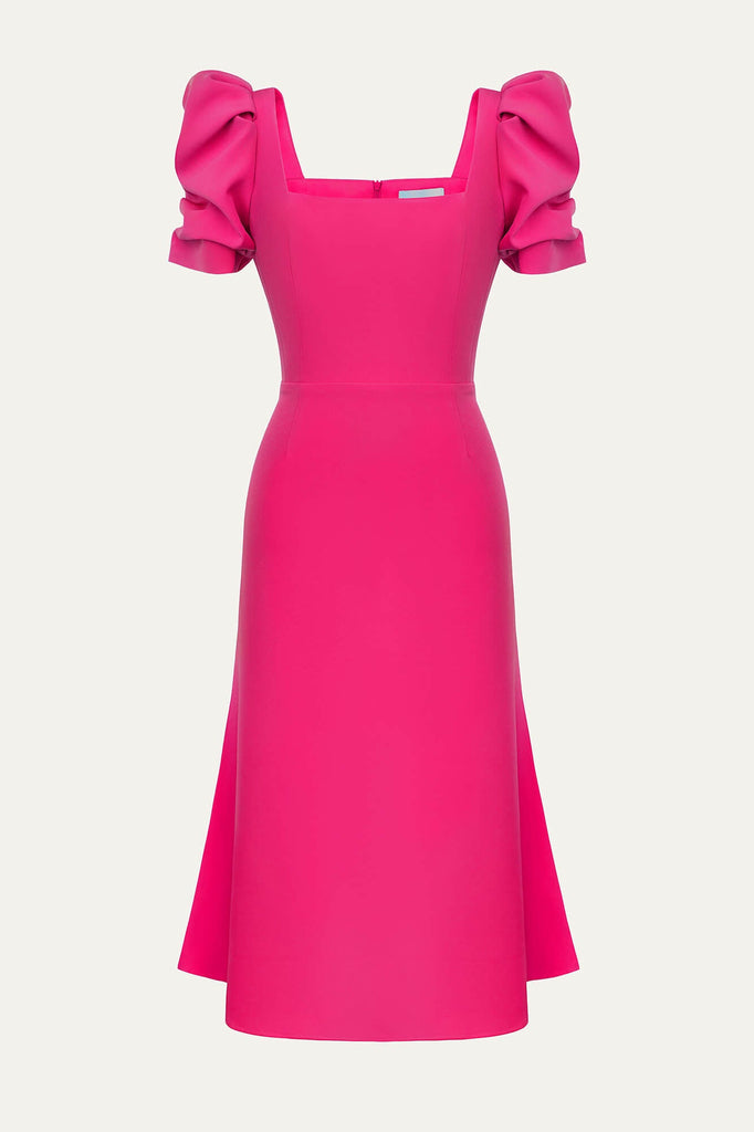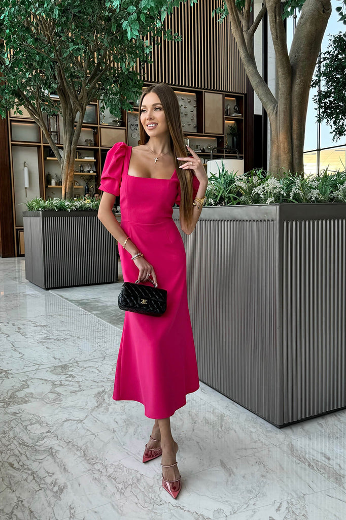 Tea party in the garden with the closests. This silhouette midi dress in Fuchsia with a godet skirt is for those who opt for a classy look but want to add a little zest while keeping it minimalistic. Trendy square neck makes the appearance elegant and short sleeves make this garment perfect to be your lovely summer outfit. Lined.