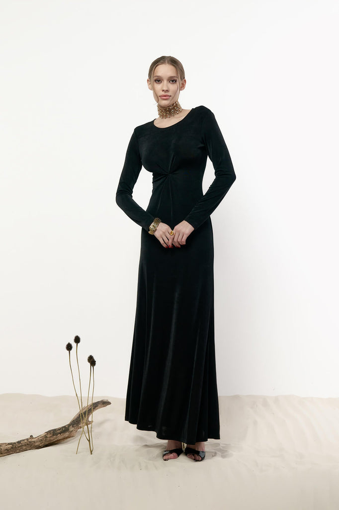 A light maxi length dress made of thin flowing black knitwear. A simple model will emphasize all the advantages of your figure and provide comfort while moving. The bodice line is decorated with a gathered detail. Perfect for both everyday wear and evening dinner.