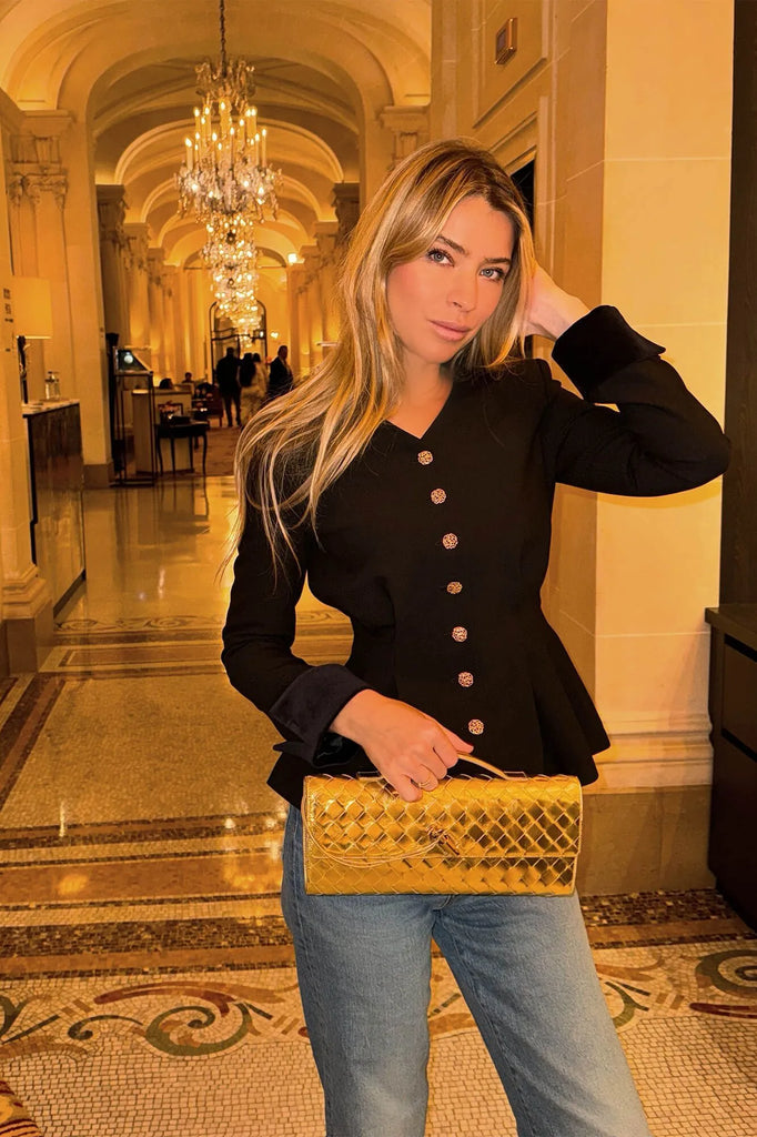 A cascade of gilded buttons runs down the front, their golden glow harmonizing with the plush velvet cuffs, adding a regal flourish to the design. This top is more than just a garment — it’s a statement of understated luxury, equally at home in the refined elegance of everyday wear or the grandeur of a special occasion.