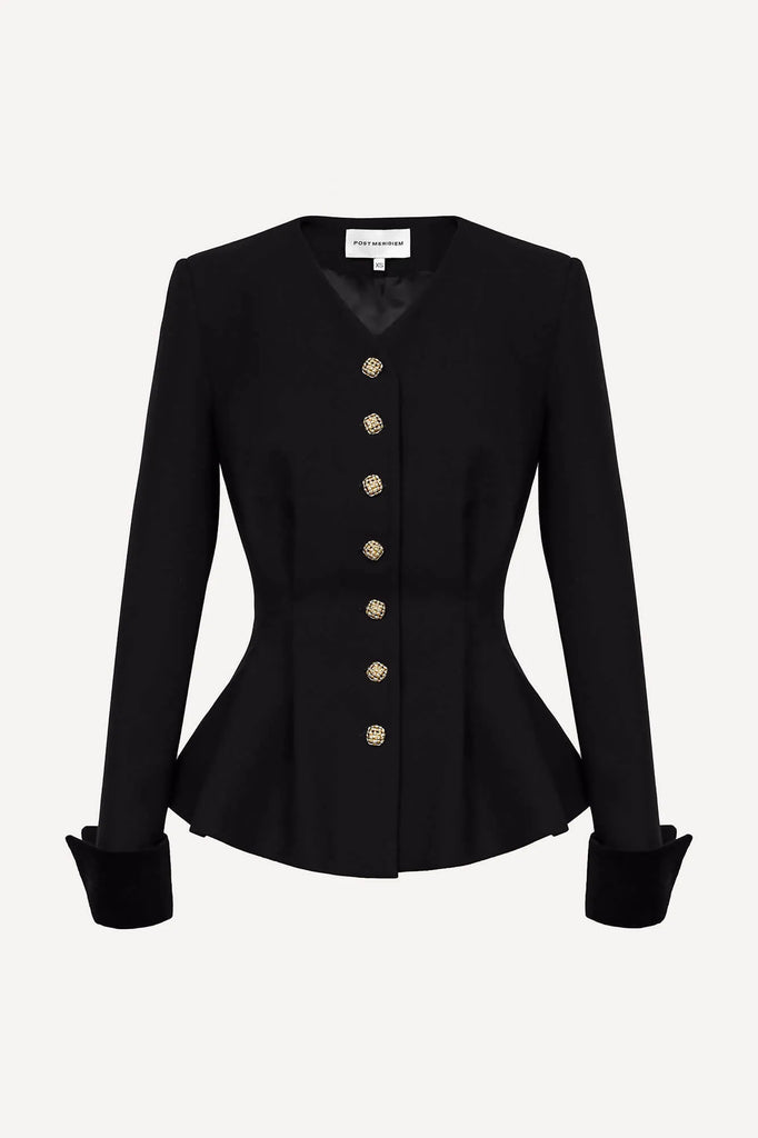 A sophisticated long-sleeve button-up top, draped in the deepest shade of black. Tailored from a sumptuous, structured fabric that caresses the figure, it sculpts a silhouette of timeless femininity and grace. The intricate seams and flared peplum artfully highlight the natural contours, cinching the waist to perfection.