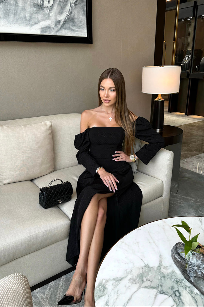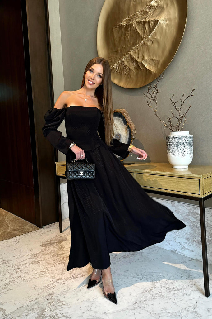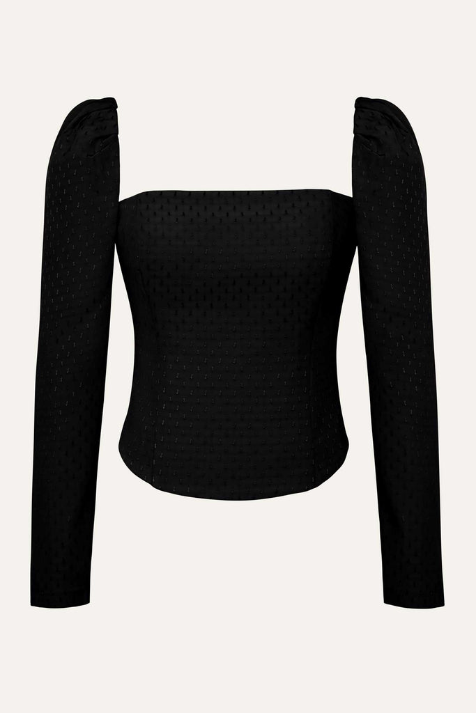 A long sleeve top in black made of textured viscose. The corset base provides a perfect fit and models the figure and the deep square neckline opens the neck and collarbones. To create a spectacular evening outfit сomplete it with a top from our collection.