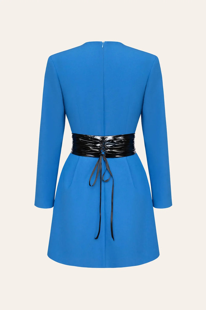 Mini dress with long sleeves in blue. A fitted silhouette and a removable rose decorated belt will perfectly emphasize your figure.