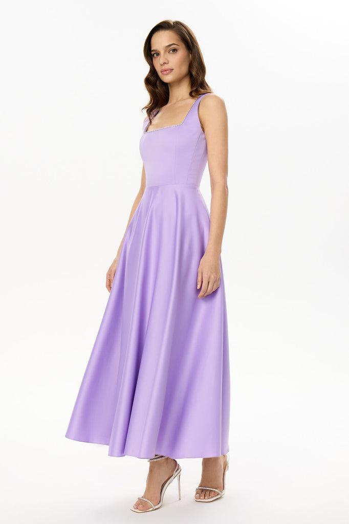 Chic and elegant midi length dress with wide straps in lavender. The neckline decorated with rhinestones makes the dress really special. Will fit nicely to every body shape. Invisible Zip Fastener.