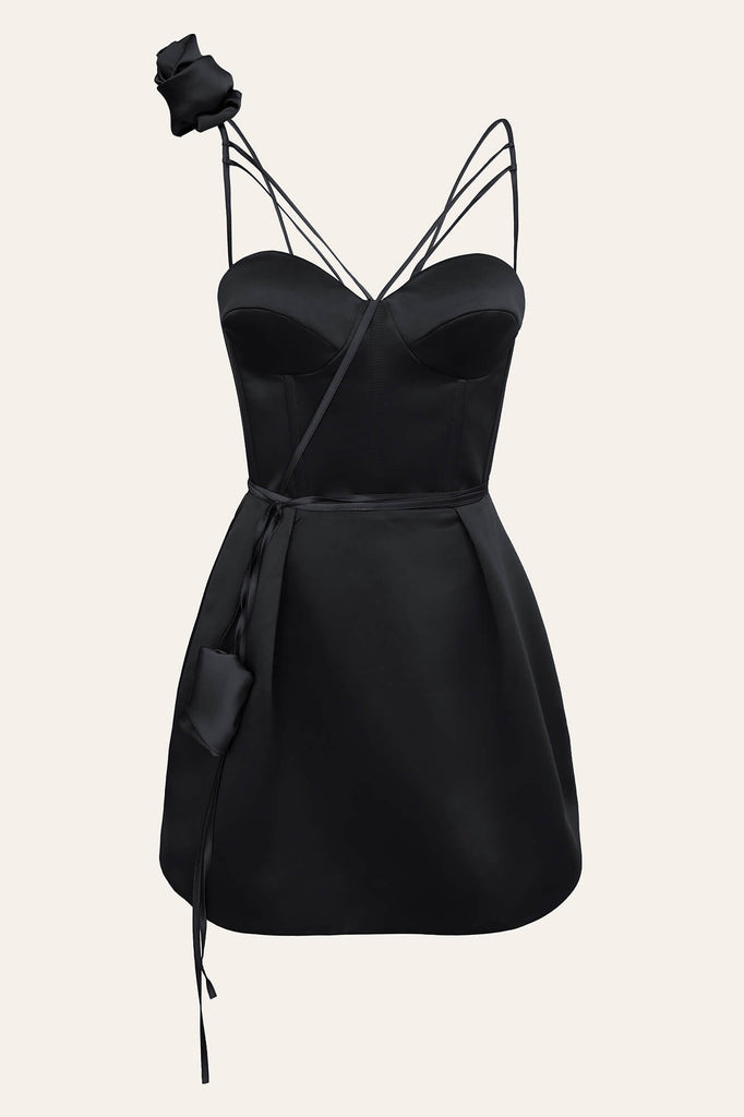 Girly, playful and youthful, that’s the vibe of our fitted corset black bell mini dress with an elegant rose decor on the shoulder. Bones and cups of the corset part delicately hug the body curves, while the bell skirt adds air and playful bounce to the look. The dress is made of medium-density fabric with a delicate sheen. Lined.