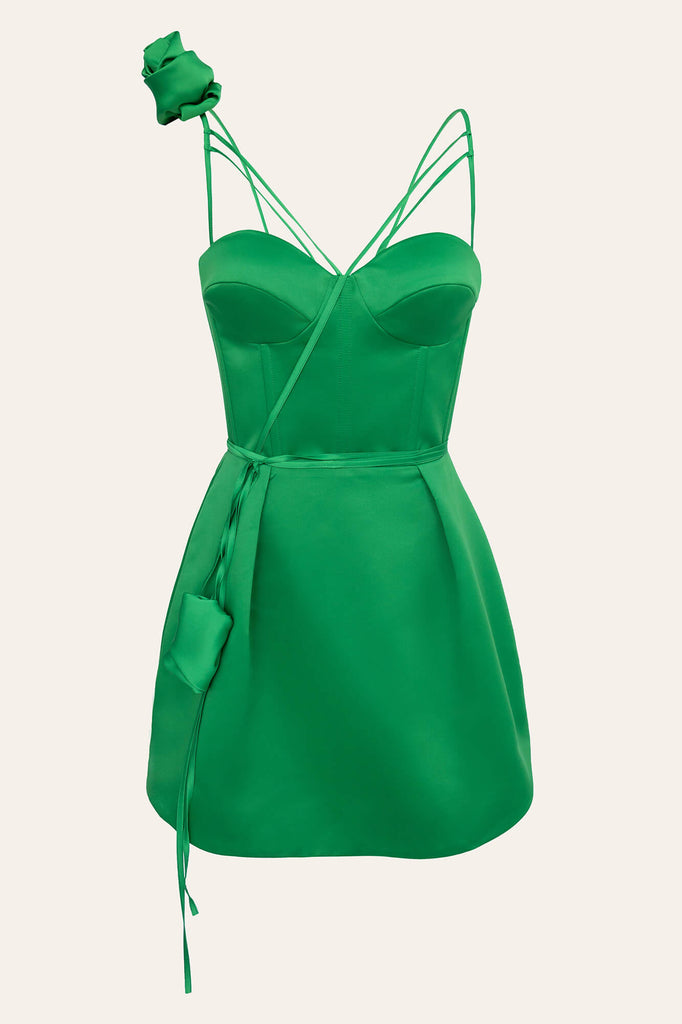 Girly, playful and youthful, that’s the vibe of our fitted corset green bell mini dress with an elegant rose decor on the shoulder. Bones and cups of the corset part delicately hug the body curves, while the bell skirt adds air and playful bounce to the look. The dress is made of medium-density fabric with a delicate sheen. Lined.