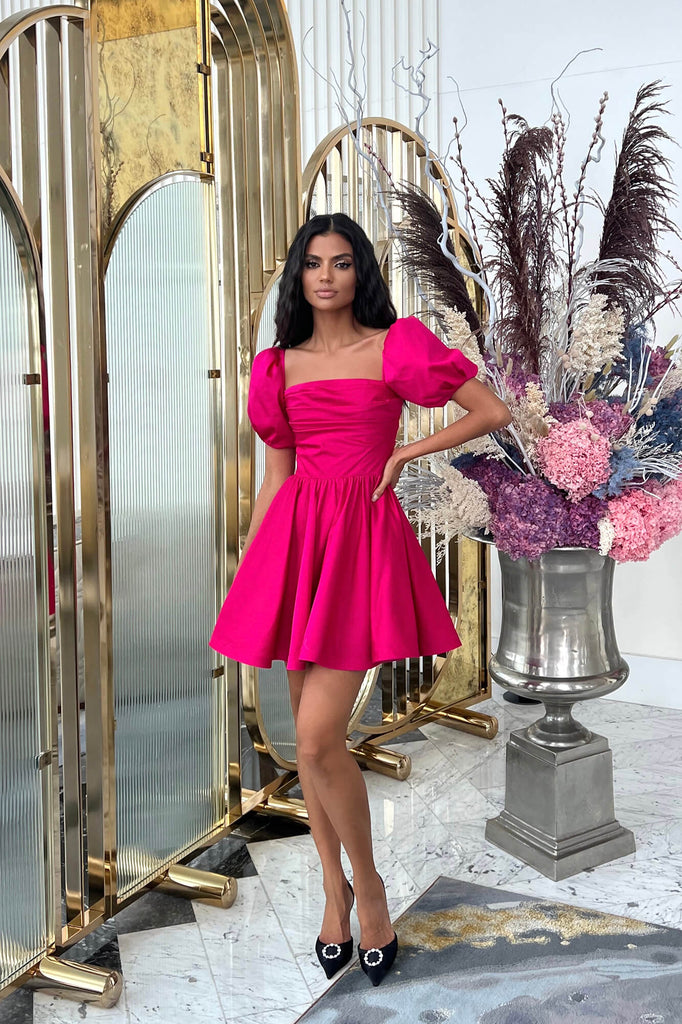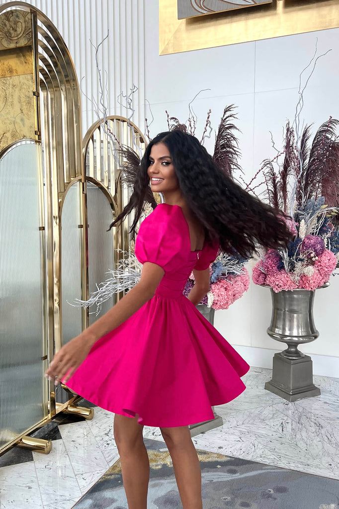 A delicate midi-length dress with the most feminine "godet" silhouette skirt in Fuchsia. Drapery on the bodice line is designed to ensure your look to be joyful and romantic. The garment has a fitted cut and puffy sleeves. The dress favorably emphasizes the silhouette, tightly fitting the hips, expanding to the bottom. The dress will make you feel the prettiest and good looking ever.
