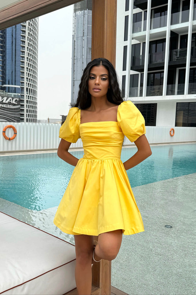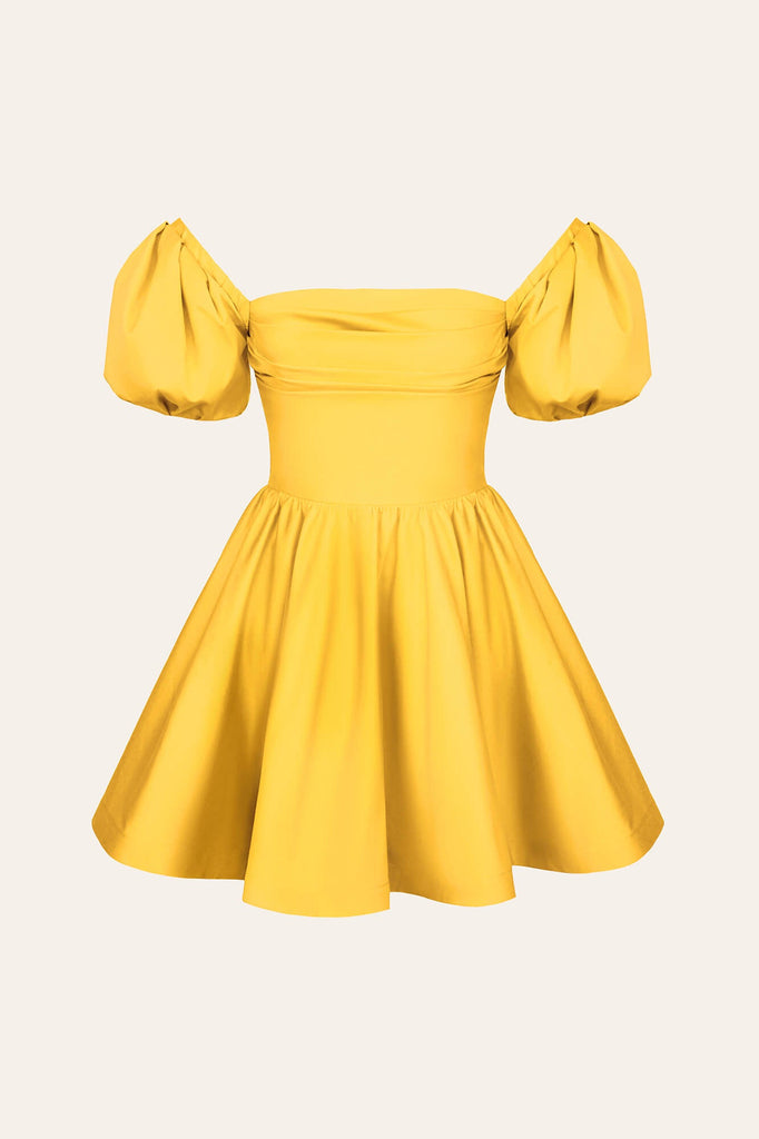 A delicate midi-length dress with the most feminine "godet" silhouette skirt in Yellow. Drapery on the bodice line is designed to ensure your look to be joyful and romantic. The garment has a fitted cut and puffy sleeves. The dress favorably emphasizes the silhouette, tightly fitting the hips, expanding to the bottom. The dress will make you feel the prettiest and good looking ever.