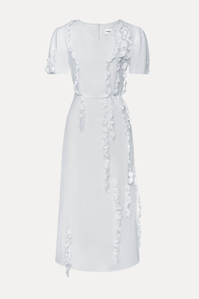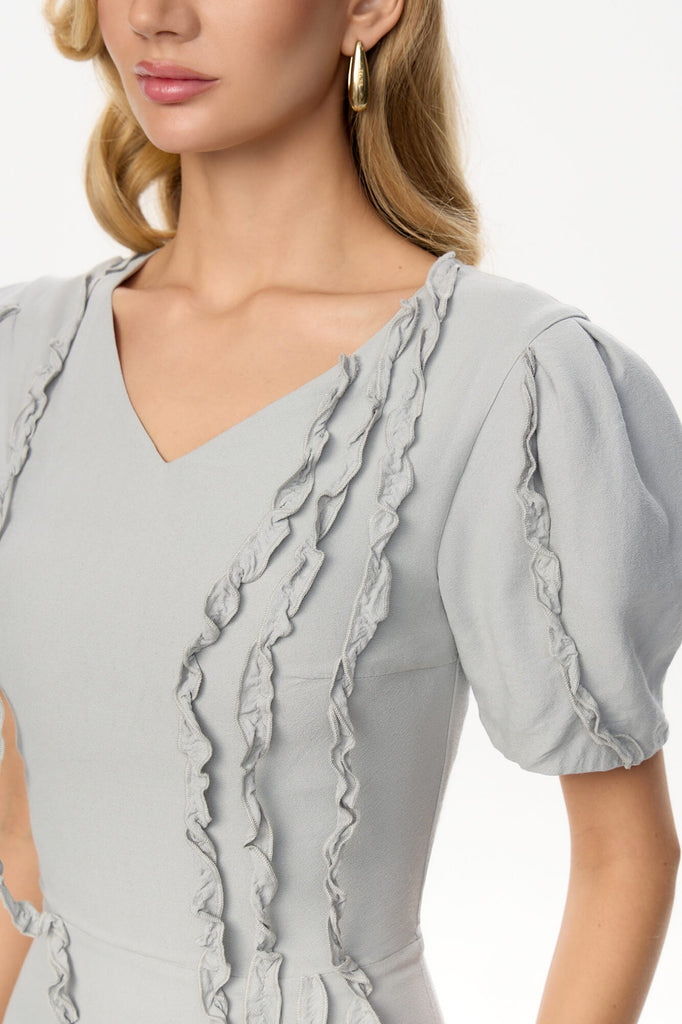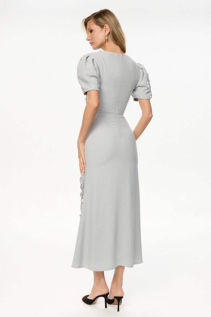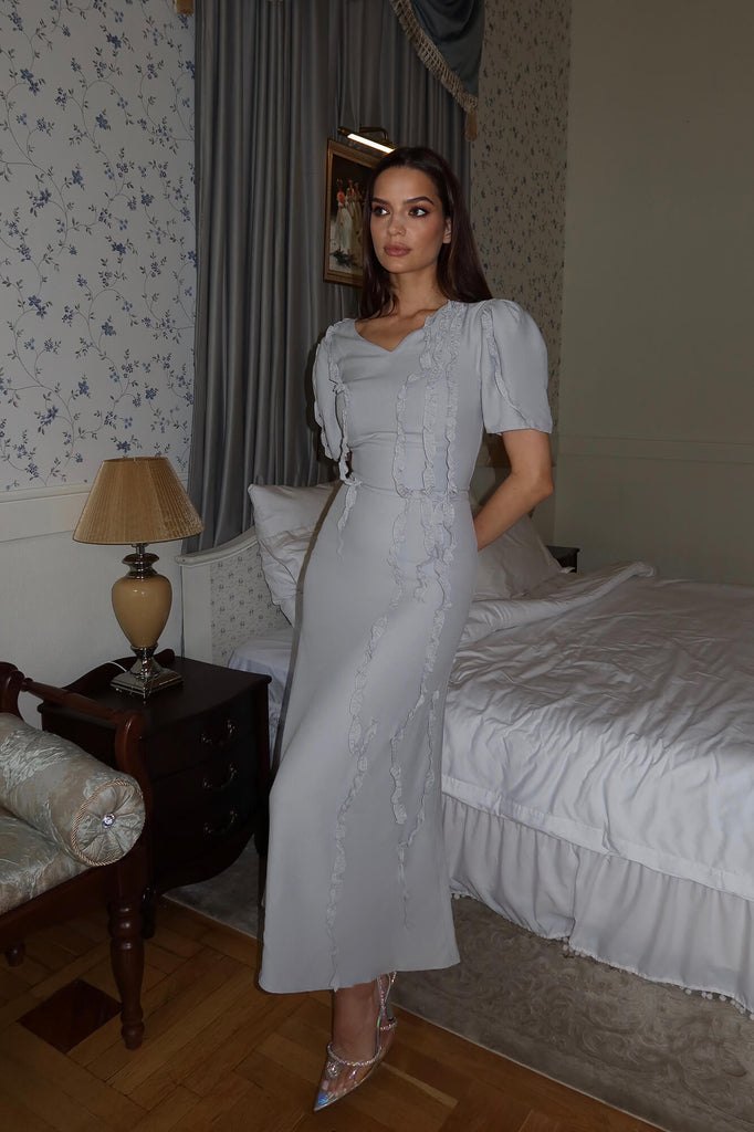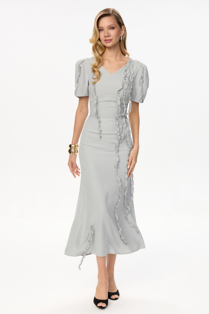 Silver Dream Midi Dress. An ethereal, midi dress embodies summer romance. With short, voluminous sleeves that add a touch of whimsical charm, this dress is a vision of effortless elegance. The V-shaped neckline elongates the neck and highlights the collarbone, while vertical frills add a touch of playful whimsy. Perfect for a special occasion or a breezy summer day, this dress is a testament to delicate beauty and timeless style.