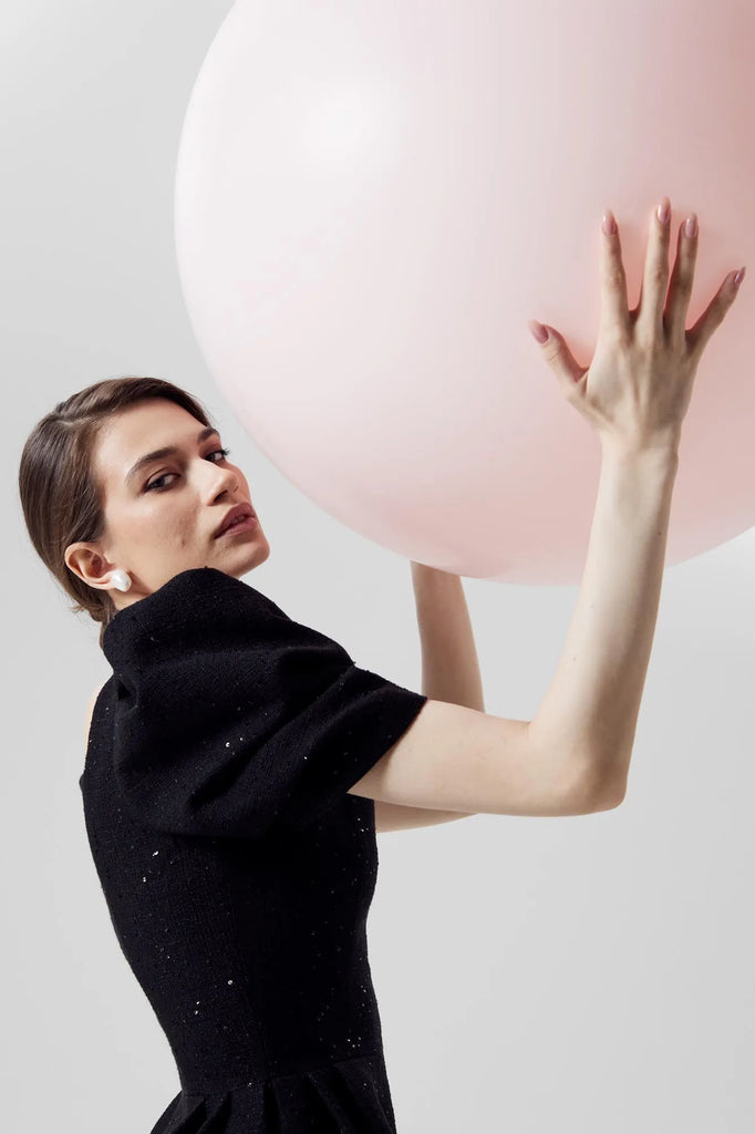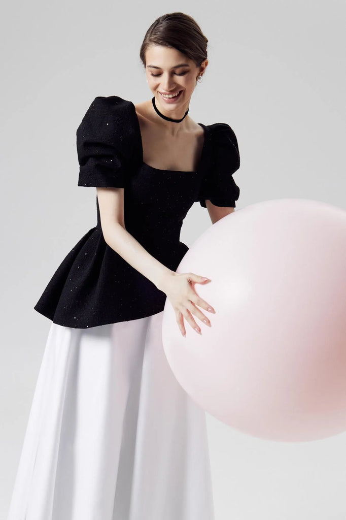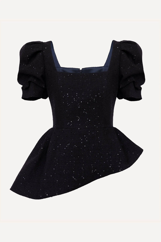 The square-neck top with voluminous draped sleeves is crafted from tweed fabric embellished with sequins. The square neckline accentuates the décolletage and visually elongates the neck, while the billowy sleeves create a striking focal point, adding femininity and sophistication to the look. The asymmetrical peplum gently flares, giving the silhouette a bold and expressive touch. This top is perfect for evening events or special occasions.