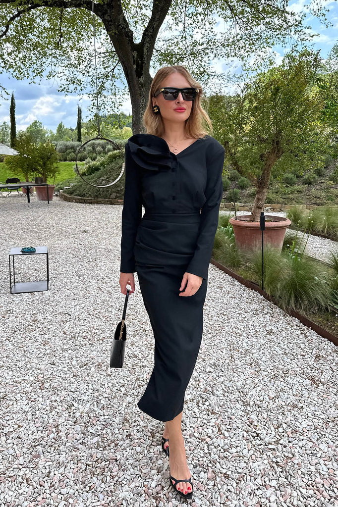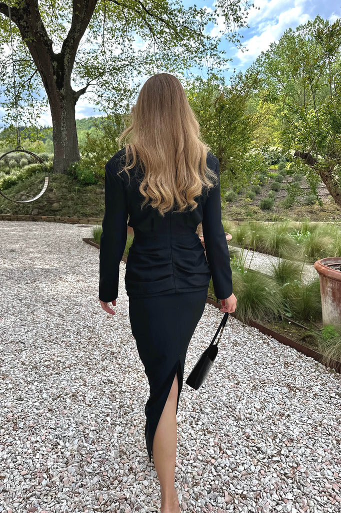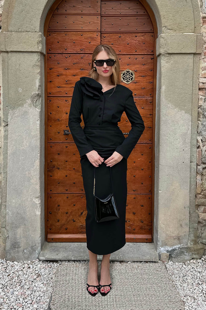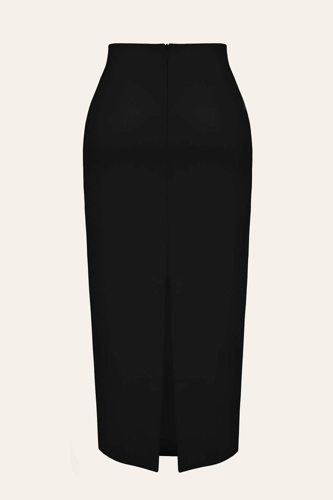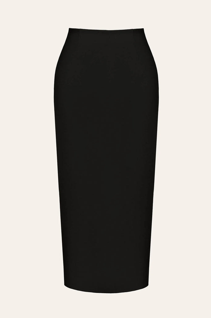 A classic black maxi skirt. Sheath silhouettes emphasizes the figure and Italian fine-wool provides incredible comfort and lightness. It fastens with a hidden zipper. To complete the look wear it with a top or a bodysuit from the new collection.