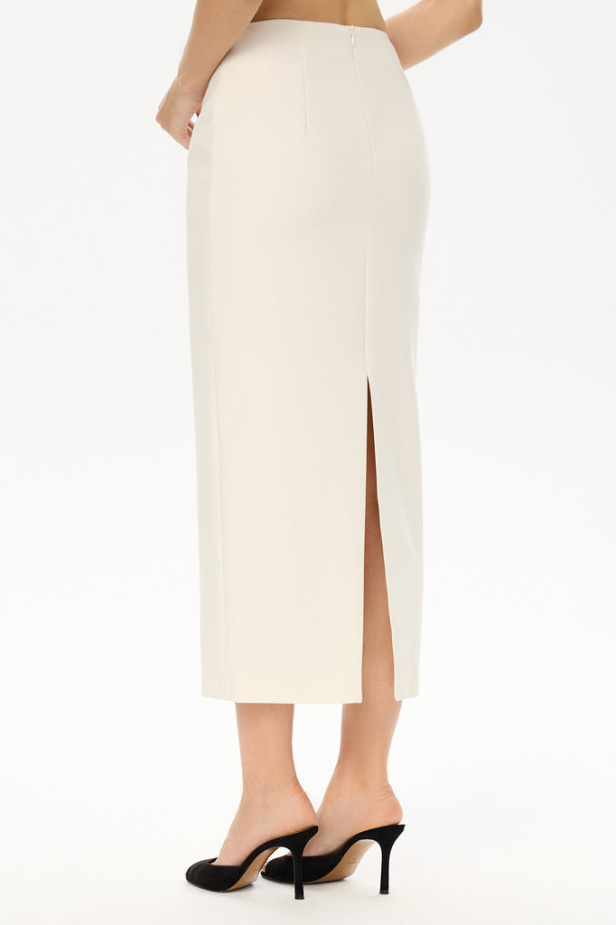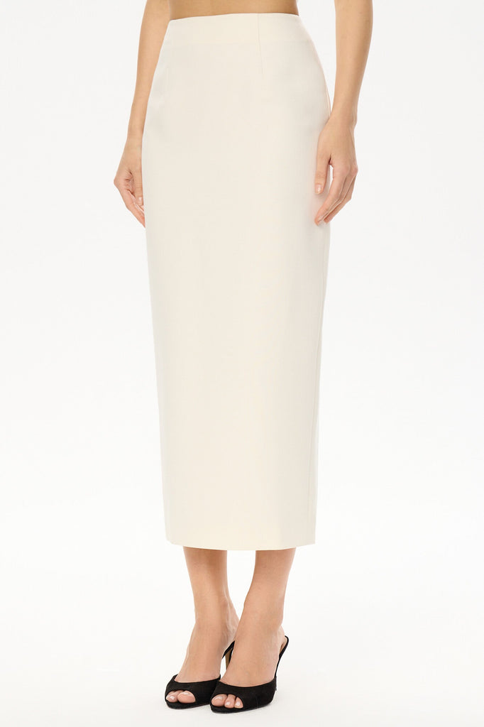 A classic milk maxi skirt. Sheath silhouettes emphasizes the figure and Italian fine-wool provides incredible comfort and lightness. It fastens with a hidden zipper. To complete the look wear it with a top or a bodysuit from the new collection.