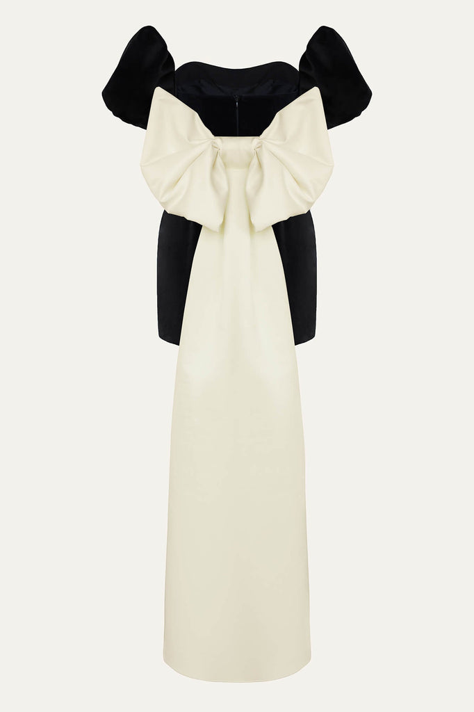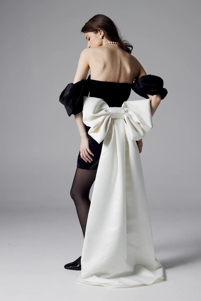 A velvet jumpsuit with a bow. This luxurious piece is a perfect combination of classic black velvet and a unique silhouette. The off-the-shoulder neckline, voluminous sleeves, and an accent bow at the back add a touch of sophistication and elegance. Perfect for special occasions and evening events.