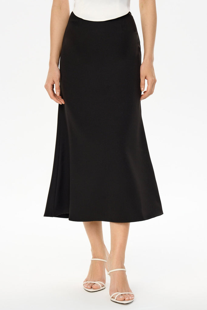 This fitted midi skirt in classic black is truly irreplaceable once bought. It is made of medium-density viscose that is known for incredible smoothness and softness. The skirt zips up with a hidden zipper. To complete the look, combine it with a matching turtleneck, or with a top from the new collection.