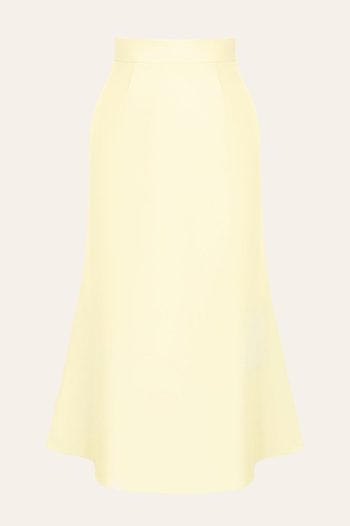 Let the sun shine day to night wearing this fitted midi skirt in light-yellow. It is made of medium-density viscose that is known for incredible smoothness and softness. The skirt zips up with a hidden zipper. To complete the look, combine it with a matching turtleneck, or with a top from the new collection.